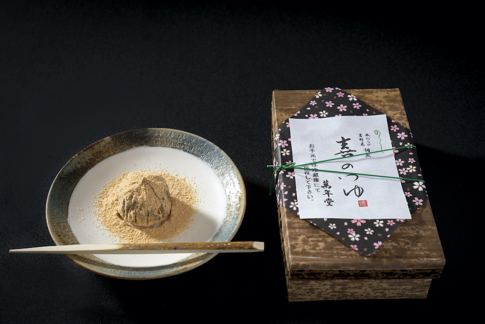 本わらび粉を口ほどけよく煉りあげ、中には黒糖を用いた柔らかな吉野本葛を包んでおります。